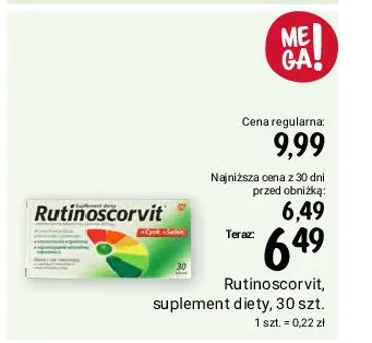 Cena produktu r贸偶ni si臋 w zale偶no艣ci od wybranego sklepu. Niestety nie posiadamy danych o aktualnych promocjach, jednak w艣r贸d archiwalnych ofert Tabletki Rutinoscorvit kosztuje od 4,99 z艂 do 6,49 z艂.