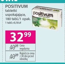 Cena produktu r贸偶ni si臋 w zale偶no艣ci od wybranego sklepu. Niestety nie posiadamy danych o aktualnych promocjach, jednak w艣r贸d archiwalnych ofert Tabletki uspokajaj膮ce Positivum kosztuje od 29,99 z艂 do 32,99 z艂.
