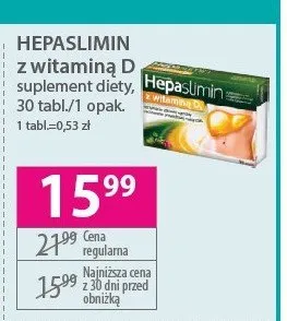 Cena produktu r贸偶ni si臋 w zale偶no艣ci od wybranego sklepu. Niestety nie posiadamy danych o aktualnych promocjach, jednak w艣r贸d archiwalnych ofert Tabletki wspomagaj膮ce w膮trob臋 Hepaslimin kosztuje od 9,99 z艂 do 15,99 z艂.