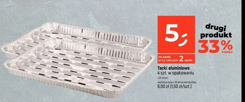 Cena produktu r贸偶ni si臋 w zale偶no艣ci od wybranego sklepu. Niestety nie posiadamy danych o aktualnych promocjach, jednak w艣r贸d archiwalnych ofert Tacka aluminiowa do grilla kosztuje od 3,99 z艂 do 5 z艂.