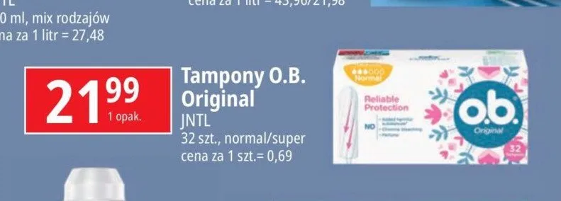 Zastanawiasz si臋, gdzie kupi膰 i ile kosztuje produkt Tampony normal O.b. original? Regularnie sprawdzamy, czy jest promocja na ten produkt w Biedronka, Lidl, Kaufland, Auchan, Netto, Makro i innych sklepach. Aktualnie nie posiadamy ofert promocyjnych na ten produkt.