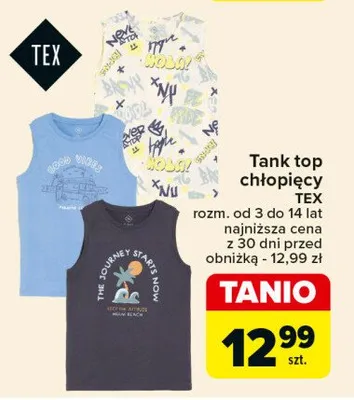 Cena produktu r贸偶ni si臋 w zale偶no艣ci od wybranego sklepu. Niestety nie posiadamy danych o aktualnych promocjach, jednak w艣r贸d archiwalnych ofert Tank top ch艂opi臋cy Tex kosztuje od 12,99 z艂.