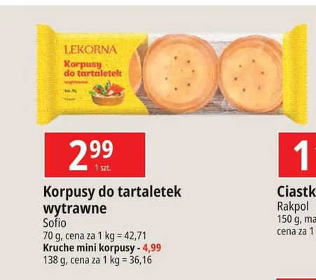 Cena produktu r贸偶ni si臋 w zale偶no艣ci od wybranego sklepu. Niestety nie posiadamy danych o aktualnych promocjach, jednak w艣r贸d archiwalnych ofert Tartaletki LEKORNA kosztuje od 2,99 z艂.