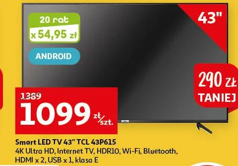 Cena produktu r贸偶ni si臋 w zale偶no艣ci od wybranego sklepu. Niestety nie posiadamy danych o aktualnych promocjach, jednak w艣r贸d archiwalnych ofert Telewizor 43" 43p615 Tcl kosztuje od 1099 z艂 do 1449 z艂.