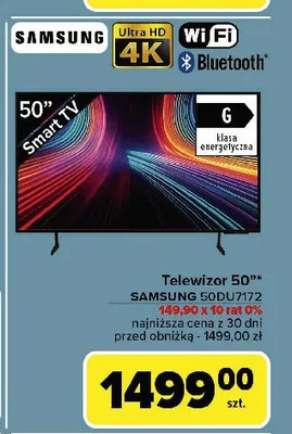 Cena produktu r贸偶ni si臋 w zale偶no艣ci od wybranego sklepu. Produkt Telewizor 50" 50du7172 Samsung mo偶esz kupi膰 w promocji ju偶 od 1399 z艂. Najta艅sza oferta, jak膮 mamy w naszej bazie jest z sieci Carrefour. Telewizor 50" 50du7172 Samsung kosztuje aktualnie 1399 z艂. Zobacz ofert臋