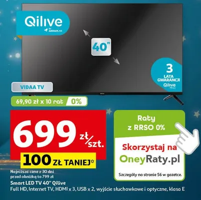 Zastanawiasz si臋, gdzie kupi膰 i ile kosztuje produkt Telewizor led 40" Qilive? Regularnie sprawdzamy, czy jest promocja na ten produkt w Biedronka, Lidl, Kaufland, Auchan, Netto, Makro i innych sklepach. Aktualnie nie posiadamy ofert promocyjnych na ten produkt.