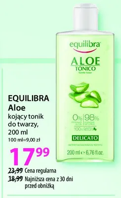 Cena produktu r贸偶ni si臋 w zale偶no艣ci od wybranego sklepu. Niestety nie posiadamy danych o aktualnych promocjach, jednak w艣r贸d archiwalnych ofert Tonik aloesowy do twarzy Equilibra kosztuje od 11,99 z艂 do 18,99 z艂.
