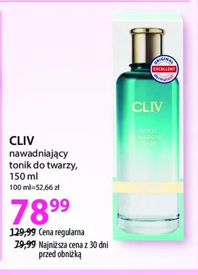 Cena produktu r贸偶ni si臋 w zale偶no艣ci od wybranego sklepu. Niestety nie posiadamy danych o aktualnych promocjach, jednak w艣r贸d archiwalnych ofert Tonik do twarzy nawadniaj膮cy CLIV MULTI HYALURONIC kosztuje od 78,99 z艂.