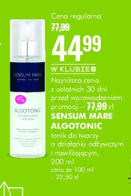 Cena produktu różni się w zależności od wybranego sklepu. Niestety nie posiadamy danych o aktualnych promocjach, jednak wśród archiwalnych ofert Tonik o działaniu nawilżającym i odżywczym algotonic SENSUM MARE kosztuje od 77,99 zł.