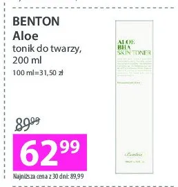 Cena produktu r贸偶ni si臋 w zale偶no艣ci od wybranego sklepu. Niestety nie posiadamy danych o aktualnych promocjach, jednak w艣r贸d archiwalnych ofert Tonik z aloesem Benton cosmetics kosztuje od 49,99 z艂 do 84,99 z艂.
