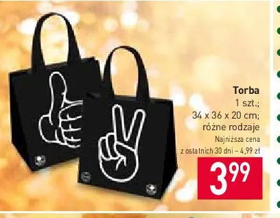 Cena produktu r贸偶ni si臋 w zale偶no艣ci od wybranego sklepu. Niestety nie posiadamy danych o aktualnych promocjach, jednak w艣r贸d archiwalnych ofert Torba 34 x 34 x 20 cm kosztuje od 3,99 z艂.