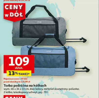 Cena produktu różni się w zależności od wybranego sklepu. Niestety nie posiadamy danych o aktualnych promocjach, jednak wśród archiwalnych ofert Torba podróżna na kółkach 65 x 34 x 33 cm kosztuje od 109 zł.