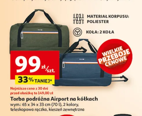 Cena produktu różni się w zależności od wybranego sklepu. Niestety nie posiadamy danych o aktualnych promocjach, jednak wśród archiwalnych ofert Torba podróżna na kółkach 70 l Airport kosztuje od 99 zł.