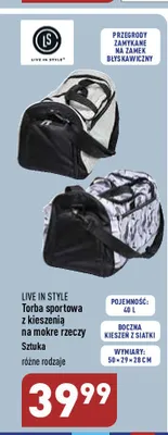 Cena produktu r贸偶ni si臋 w zale偶no艣ci od wybranego sklepu. Niestety nie posiadamy danych o aktualnych promocjach, jednak w艣r贸d archiwalnych ofert Torba sportowa z kieszeni膮 na mokre rzeczy Live in style kosztuje od 39,99 z艂.