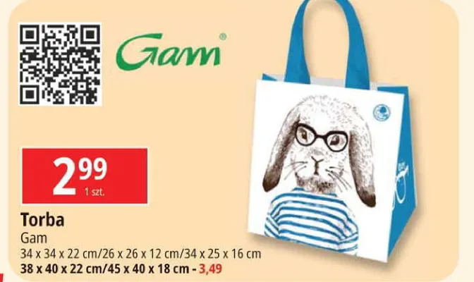 Cena produktu r贸偶ni si臋 w zale偶no艣ci od wybranego sklepu. Niestety nie posiadamy danych o aktualnych promocjach, jednak w艣r贸d archiwalnych ofert Torba tekstylna 34 x 25 x 16 cm Gam kosztuje od 2,99 z艂.