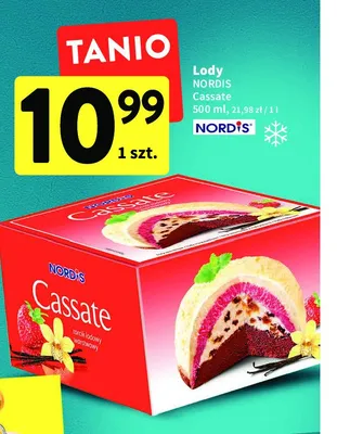 Przegl膮daj podobne oferty promocyjne do Torcik lodowy cassate truskawkowo-czekoladowo-waniliowy z bit膮 艣mietan膮 i rodzynkami Nordis!