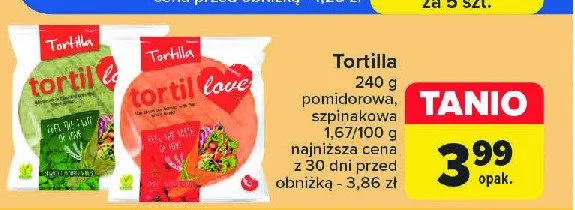 Cena produktu r贸偶ni si臋 w zale偶no艣ci od wybranego sklepu. Produkt Tortilla pomidorowa Tortillove mo偶esz kupi膰 w promocji ju偶 od 3,49 z艂. Najta艅sza oferta, jak膮 mamy w naszej bazie jest z sieci Supeco. Tortilla pomidorowa Tortillove kosztuje aktualnie 3,49 z艂. Zobacz ofert臋