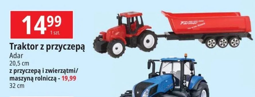 Cena produktu r贸偶ni si臋 w zale偶no艣ci od wybranego sklepu. Niestety nie posiadamy danych o aktualnych promocjach, jednak w艣r贸d archiwalnych ofert Traktor z przyczep膮 20.5 cm Adar kosztuje od 14,99 z艂.