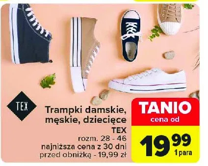 Nie wiesz gdzie kupi膰 produkt Trampki damskie Tex w promocji? Aktualnie produkt Trampki damskie Tex znajduje si臋 w atrakcyjnej cenie w sklepach Biedronka. Opr贸cz tego produkt mo偶na kupi膰 w innych sklepach, jednak aktulanie nie posiadamy informacji o promocjach w nich.