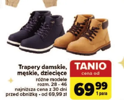 Cena produktu r贸偶ni si臋 w zale偶no艣ci od wybranego sklepu. Produkt Trapery m臋skie mo偶esz kupi膰 w promocji ju偶 od 79,9 z艂 do 89,99 z艂. Najta艅sza oferta, jak膮 mamy w naszej bazie jest z sieci Biedronka. Trapery m臋skie kosztuje aktualnie 79,9 z艂. Zobacz ofert臋