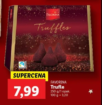 Zastanawiasz si臋, gdzie kupi膰 i ile kosztuje produkt Trufle kakaowe Favorina? Regularnie sprawdzamy, czy jest promocja na ten produkt w Biedronka, Lidl, Kaufland, Auchan, Netto, Makro i innych sklepach. Aktualnie nie posiadamy ofert promocyjnych na ten produkt.