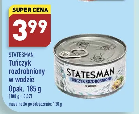 Cena produktu r贸偶ni si臋 w zale偶no艣ci od wybranego sklepu. Niestety nie posiadamy danych o aktualnych promocjach, jednak w艣r贸d archiwalnych ofert Tu艅czyk w wodzie Statesman kosztuje od 2,59 z艂 do 3,99 z艂.