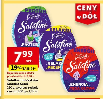 Cena produktu różni się w zależności od wybranego sklepu. Niestety nie posiadamy danych o aktualnych promocjach, jednak wśród archiwalnych ofert Tuńczyk z fasolą szparagową, ciecierzycą i siemieniem lnianym relaks Graal salatino kosztuje od 6,99 zł do 8,99 zł.