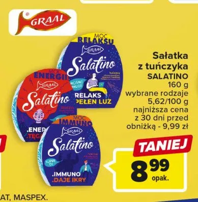 Cena produktu różni się w zależności od wybranego sklepu. Niestety nie posiadamy danych o aktualnych promocjach, jednak wśród archiwalnych ofert Tuńczyk z kukurydzą i porem z wyciągiem z ziół immuno Graal salatino kosztuje od 6,99 zł do 9,79 zł.