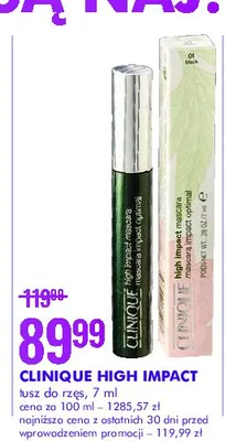 Cena produktu r贸偶ni si臋 w zale偶no艣ci od wybranego sklepu. Niestety nie posiadamy danych o aktualnych promocjach, jednak w艣r贸d archiwalnych ofert Tusz do rz臋s CLINIQUE HIGH IMPACT MASCARA kosztuje od 89,99 z艂.