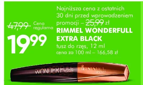 Cena produktu r贸偶ni si臋 w zale偶no艣ci od wybranego sklepu. Niestety nie posiadamy danych o aktualnych promocjach, jednak w艣r贸d archiwalnych ofert Tusz do rz臋s Rimmel wonderfull extreme black kosztuje od 17,99 z艂 do 19,99 z艂.