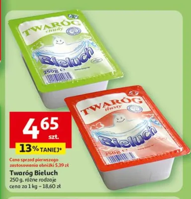 Cena produktu r贸偶ni si臋 w zale偶no艣ci od wybranego sklepu. Produkt Twar贸g chudy Bieluch mo偶esz kupi膰 w promocji ju偶 od 4,15 z艂. Najta艅sza oferta, jak膮 mamy w naszej bazie jest z sieci Auchan. Twar贸g chudy Bieluch kosztuje aktualnie 4,15 z艂. Zobacz ofert臋