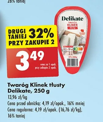 Cena produktu r贸偶ni si臋 w zale偶no艣ci od wybranego sklepu. Niestety nie posiadamy danych o aktualnych promocjach, jednak w艣r贸d archiwalnych ofert Twar贸g klinek t艂usty Delikate kosztuje od 1,95 z艂 do 3,49 z艂.