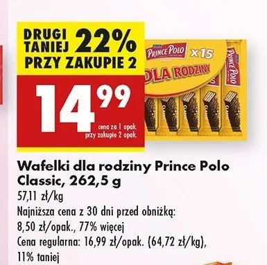 Cena produktu r贸偶ni si臋 w zale偶no艣ci od wybranego sklepu. Niestety nie posiadamy danych o aktualnych promocjach, jednak w艣r贸d archiwalnych ofert Wafelek classic Prince polo family kosztuje od 6,99 z艂 do 14,99 z艂.