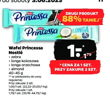 Cena produktu r贸偶ni si臋 w zale偶no艣ci od wybranego sklepu. Produkt Wafelek Princessa zebra mo偶esz kupi膰 w promocji ju偶 od 1,67 z艂 do 1,89 z艂. Najta艅sza oferta, jak膮 mamy w naszej bazie jest z sieci Makro. Wafelek Princessa zebra kosztuje aktualnie 1,67 z艂. Zobacz ofert臋