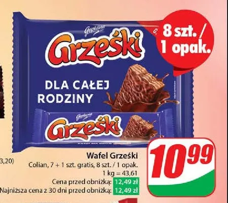 Cena produktu r贸偶ni si臋 w zale偶no艣ci od wybranego sklepu. Niestety nie posiadamy danych o aktualnych promocjach, jednak w艣r贸d archiwalnych ofert Wafelek w czekoladzie Grze艣ki kosztuje od 7,46 z艂 do 10,99 z艂.