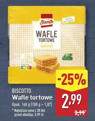 Cena produktu r贸偶ni si臋 w zale偶no艣ci od wybranego sklepu. Niestety nie posiadamy danych o aktualnych promocjach, jednak w艣r贸d archiwalnych ofert Wafle tortowe kwadratowe Biscotto kosztuje od 2,99 z艂.