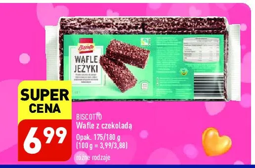 Cena produktu r贸偶ni si臋 w zale偶no艣ci od wybranego sklepu. Niestety nie posiadamy danych o aktualnych promocjach, jednak w艣r贸d archiwalnych ofert Wafle z piank膮 cukrow膮 oblane czekolad膮 Biscotto kosztuje od 4,49 z艂 do 6,99 z艂.