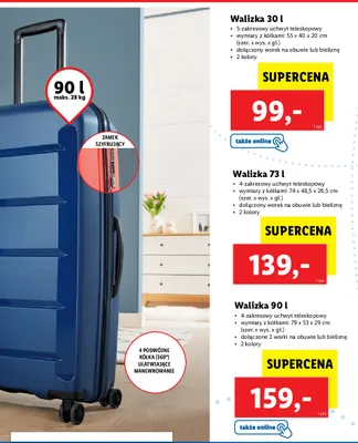Cena produktu r贸偶ni si臋 w zale偶no艣ci od wybranego sklepu. Produkt Walizka 90 l mo偶esz kupi膰 w promocji ju偶 od 132,99 z艂 do 183,27 z艂. Najta艅sza oferta, jak膮 mamy w naszej bazie jest z sieci Aldi. Walizka 90 l kosztuje aktualnie 132,99 z艂. Zobacz ofert臋