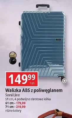Cena produktu r贸偶ni si臋 w zale偶no艣ci od wybranego sklepu. Niestety nie posiadamy danych o aktualnych promocjach, jednak w艣r贸d archiwalnych ofert Walizka abs z poliw臋glanem 61 cm Semi line kosztuje od 179,99 z艂.