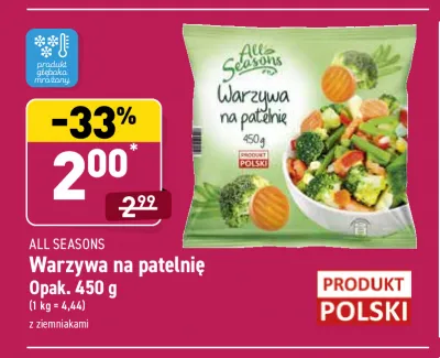 Cena produktu r贸偶ni si臋 w zale偶no艣ci od wybranego sklepu. Niestety nie posiadamy danych o aktualnych promocjach, jednak w艣r贸d archiwalnych ofert Warzywa na patelni臋 z ziemniakami All seasons kosztuje od 2 z艂.