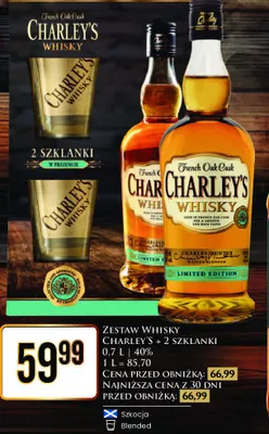 Cena produktu r贸偶ni si臋 w zale偶no艣ci od wybranego sklepu. Niestety nie posiadamy danych o aktualnych promocjach, jednak w艣r贸d archiwalnych ofert Whisky + 2 szklanki CHARLEY'S ORIGINAL kosztuje od 59,99 z艂.