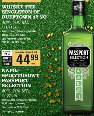 Cena produktu r贸偶ni si臋 w zale偶no艣ci od wybranego sklepu. Niestety nie posiadamy danych o aktualnych promocjach, jednak w艣r贸d archiwalnych ofert Whisky 40% Passport selection kosztuje od 44,99 z艂.