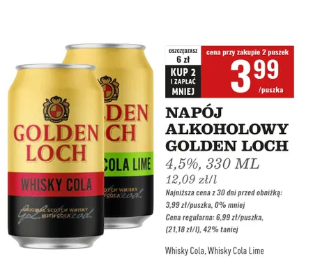 Cena produktu r贸偶ni si臋 w zale偶no艣ci od wybranego sklepu. Niestety nie posiadamy danych o aktualnych promocjach, jednak w艣r贸d archiwalnych ofert Whisky + cola lime GOLDEN LOCH kosztuje od 3,99 z艂 do 4,99 z艂.