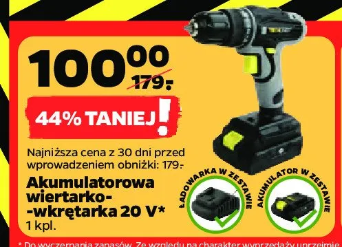 Cena produktu r贸偶ni si臋 w zale偶no艣ci od wybranego sklepu. Produkt Wiertarko - wkr臋tarka 20v mo偶esz kupi膰 w promocji ju偶 od 159,99 z艂 do 199 z艂. Najta艅sza oferta, jak膮 mamy w naszej bazie jest z sieci Kaufland. Wiertarko - wkr臋tarka 20v kosztuje aktualnie 159,99 z艂. Zobacz ofert臋