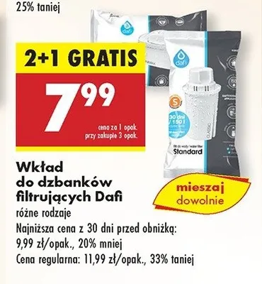 Cena produktu r贸偶ni si臋 w zale偶no艣ci od wybranego sklepu. Niestety nie posiadamy danych o aktualnych promocjach, jednak w艣r贸d archiwalnych ofert Wk艂ad filtruj膮cy Dafi kosztuje od 7,99 z艂 do 27,99 z艂.