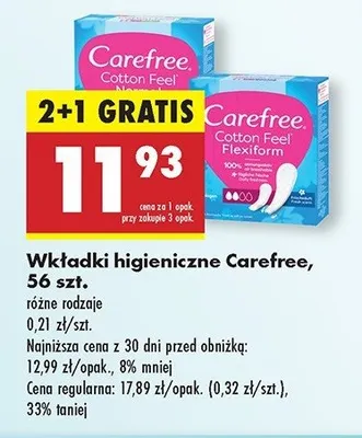 Cena produktu r贸偶ni si臋 w zale偶no艣ci od wybranego sklepu. Niestety nie posiadamy danych o aktualnych promocjach, jednak w艣r贸d archiwalnych ofert Wk艂adki cotton feel Carefree kosztuje od 9,99 z艂 do 14,99 z艂.