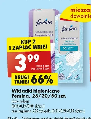 Cena produktu r贸偶ni si臋 w zale偶no艣ci od wybranego sklepu. Niestety nie posiadamy danych o aktualnych promocjach, jednak w艣r贸d archiwalnych ofert Wk艂adki higieniczne everyday protection Femina classic kosztuje od 3,29 z艂 do 3,99 z艂.