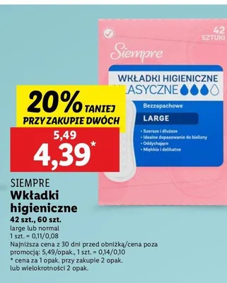 Cena produktu r贸偶ni si臋 w zale偶no艣ci od wybranego sklepu. Niestety nie posiadamy danych o aktualnych promocjach, jednak w艣r贸d archiwalnych ofert Wk艂adki normal Siempre kosztuje od 3,99 z艂 do 4,39 z艂.