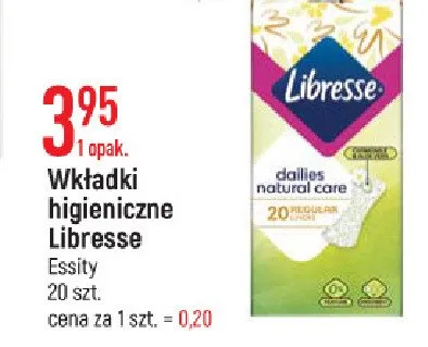 Cena produktu r贸偶ni si臋 w zale偶no艣ci od wybranego sklepu. Niestety nie posiadamy danych o aktualnych promocjach, jednak w艣r贸d archiwalnych ofert Wk艂adki regular chamomile & aloe vera LIBRESSE DAILIES NATURAL CARE kosztuje od 3,95 z艂.