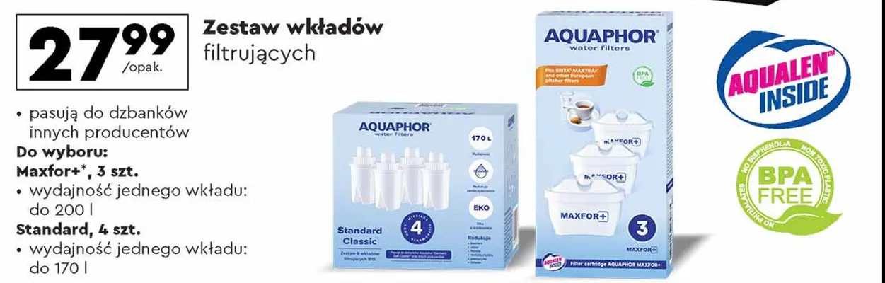 Cena produktu r贸偶ni si臋 w zale偶no艣ci od wybranego sklepu. Niestety nie posiadamy danych o aktualnych promocjach, jednak w艣r贸d archiwalnych ofert Wk艂ady filtruj膮ce standard classic Aquaphor kosztuje od 24,99 z艂 do 27,99 z艂.